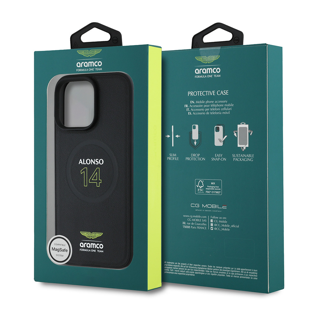 Apple iPhone 16 Pro Max Kılıf Aston Martin Orjinal Lisanslı M-safe Şarj Özellikli PU Deri Alonso 14 Baskılı Kapak